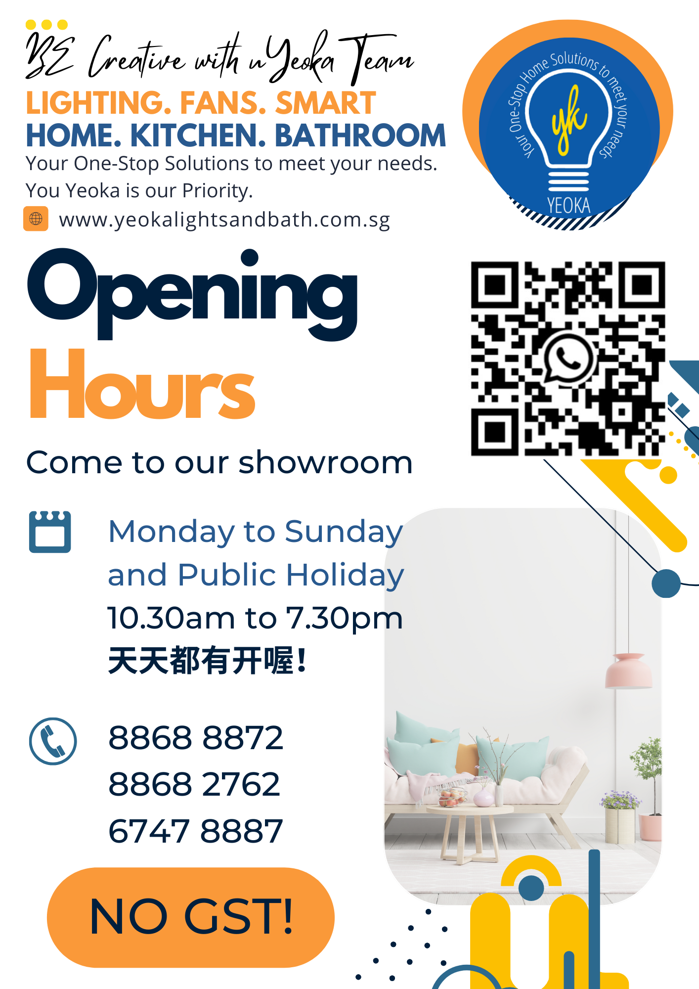 Feel free to contact us via our contact form or WhatsApp us if you have any enquiries on lighting, ceiling fans, bathroom accessories and kitchen appliances. Your one stop lighting shop at Kembangan Bedok area.